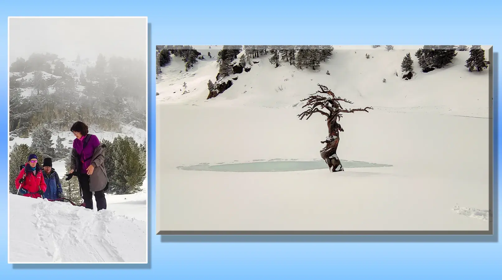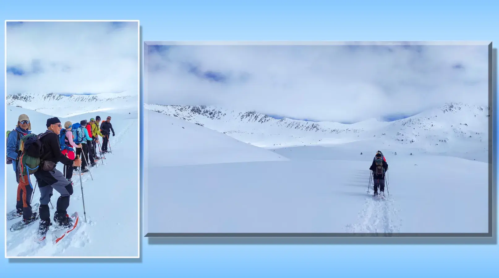 J 3 et fin - cirque et lac de Baciber. Merci "super JP encadrant" qui nous a offert cette journée inoubliable, ensoleillée et pourtant improbable, avec un départ sous la neige et le brouillard ! Haute montagne en raquettes c'est rude, mais quelle beauté, quelle "blanchitude"!