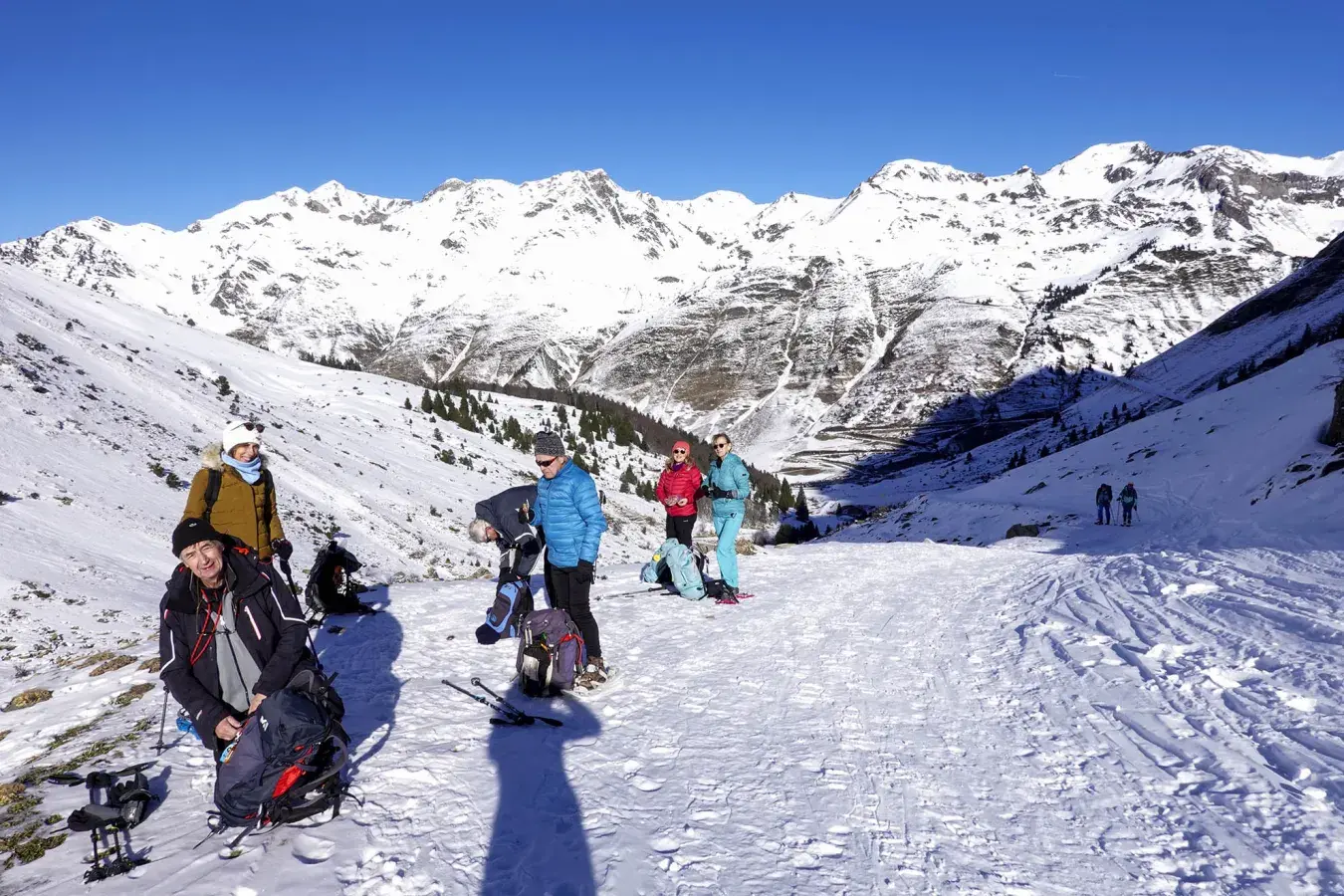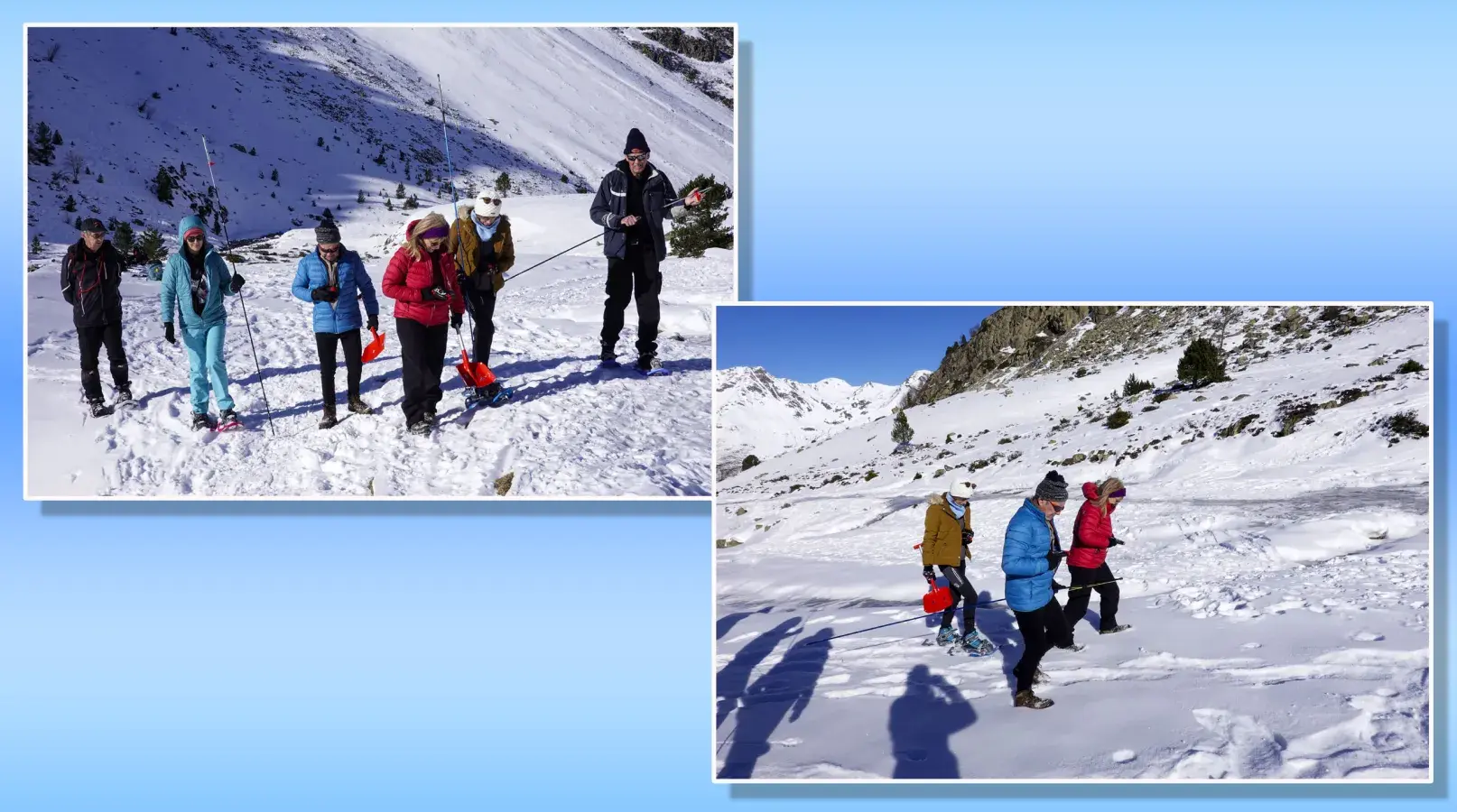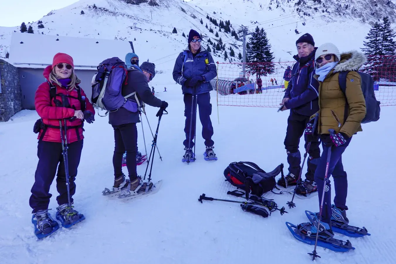 Comment chausser des raquettes dans le bon sens; nous sommes 7 joyeux lurons prêts à arpenter le GR enneigé puis glacé