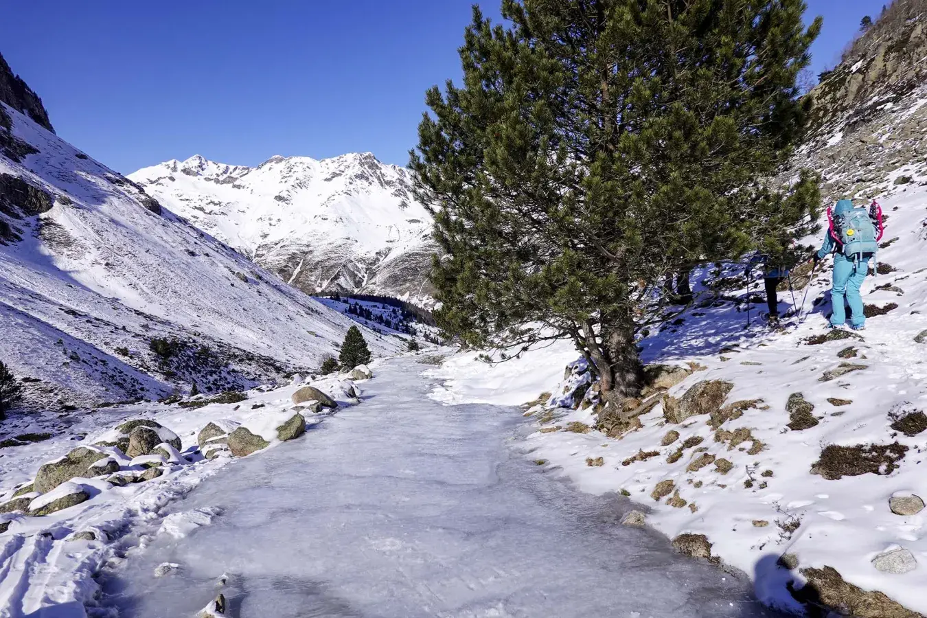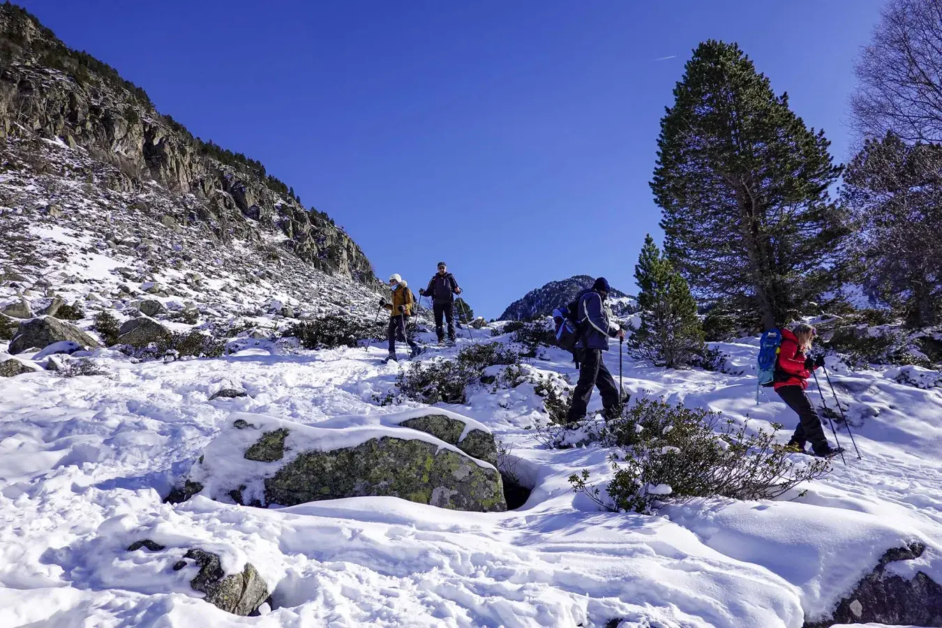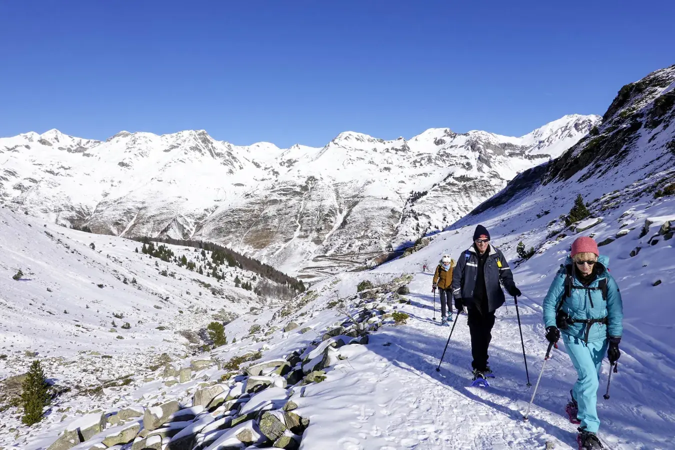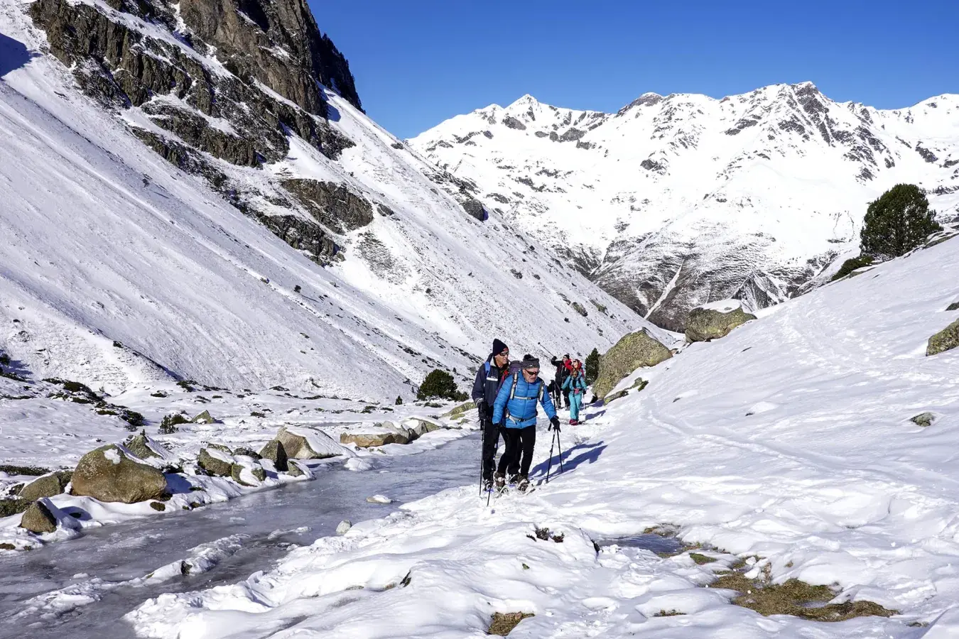 Comment chausser des raquettes dans le bon sens; nous sommes 7 joyeux lurons prêts à arpenter le GR enneigé puis glacé